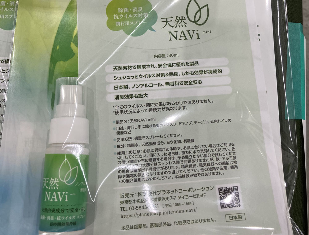 NEWS 除菌・消臭・抗ウイルススプレー天然NAVi 販売開始しました 2021.3.20 介護業界最大の商談展「ケアテックス東京」出店を契機に、除菌・消臭・抗ウイルススプレー天然NAVi mini 携行用の販売を開始しました。 天然NAViは私どもプラネットコーポレーションが企画販売する、天然由来成分100%の携行用、除菌・消臭・抗ウイルススプレーです。 日本製・ノンアルコール・無香料で、99.9%の除菌力と消臭効果にも優れ、安心してお使いいただけます。 お求めは右のバナーよりどうぞ。 投稿者: hamajo NEWS プラネットコーポレーションへ社名変更のお知らせ 前の記事 天然NAViについてお客様から感想をいただきました。 次の記事